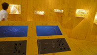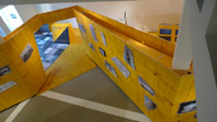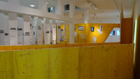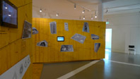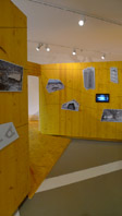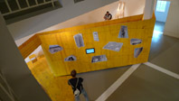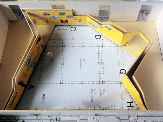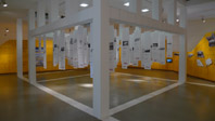 A spatial construct is positioned within changing distance to both walls and floor. As a sculptural double faced strip the wall swirls about the existant columns and forms 3 cabinets.